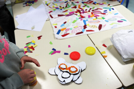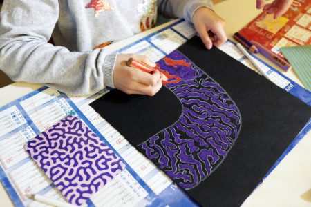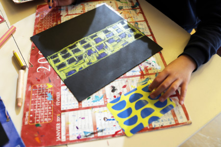Chaque enfant réalise un carré du puzzle puis nous venons l’assembler comme des pixels qui s’animent pour former l’image entière.