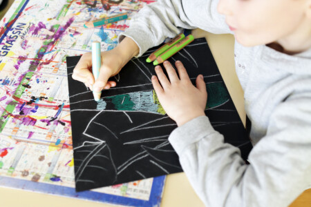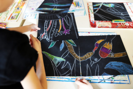 Création de deux grands dessins aux crayons de couleur sur fond noir.