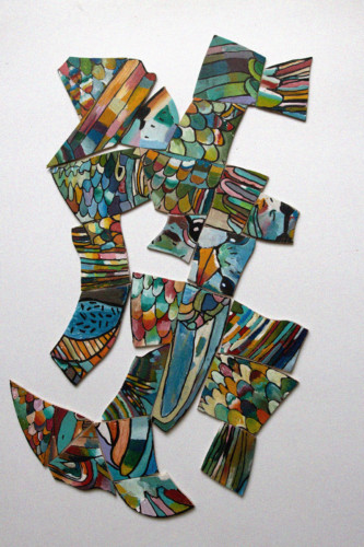 Création d’un décor en peinture et de 3 Marionnettes par superposition de cartons découpés pour la tête. Dessins et collages de diverses formes par répétition et accumulation sur le tissu.